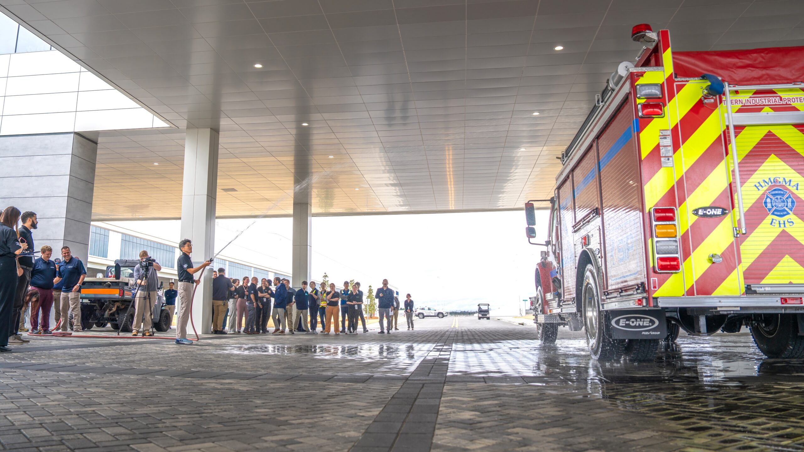 The wet down tradition dates back to the era of horse‑drawn fire wagons, when crews washed down their equipment after returning from a call. When a new engine arrived, firefighters sprayed it with water to mark its introduction into service. HMGMA honored this history as Meta Pros, HMGMA CEO Tony Heo, and members of the Emergency Response Team took part in the ceremonial washing of the new apparatus.